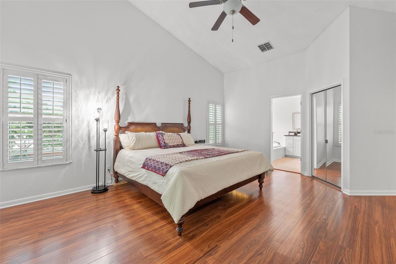 Other Interior Features: Cathedral Ceiling(s), Ceiling Fans(s), High Ceilings, Living Room/Dining Room Combo, Open Floorplan, Primary Bedroom Main Floor, Stone Counters, Thermostat, Vaulted Ceiling(s), Walk-In Closet(s), Window Treatments