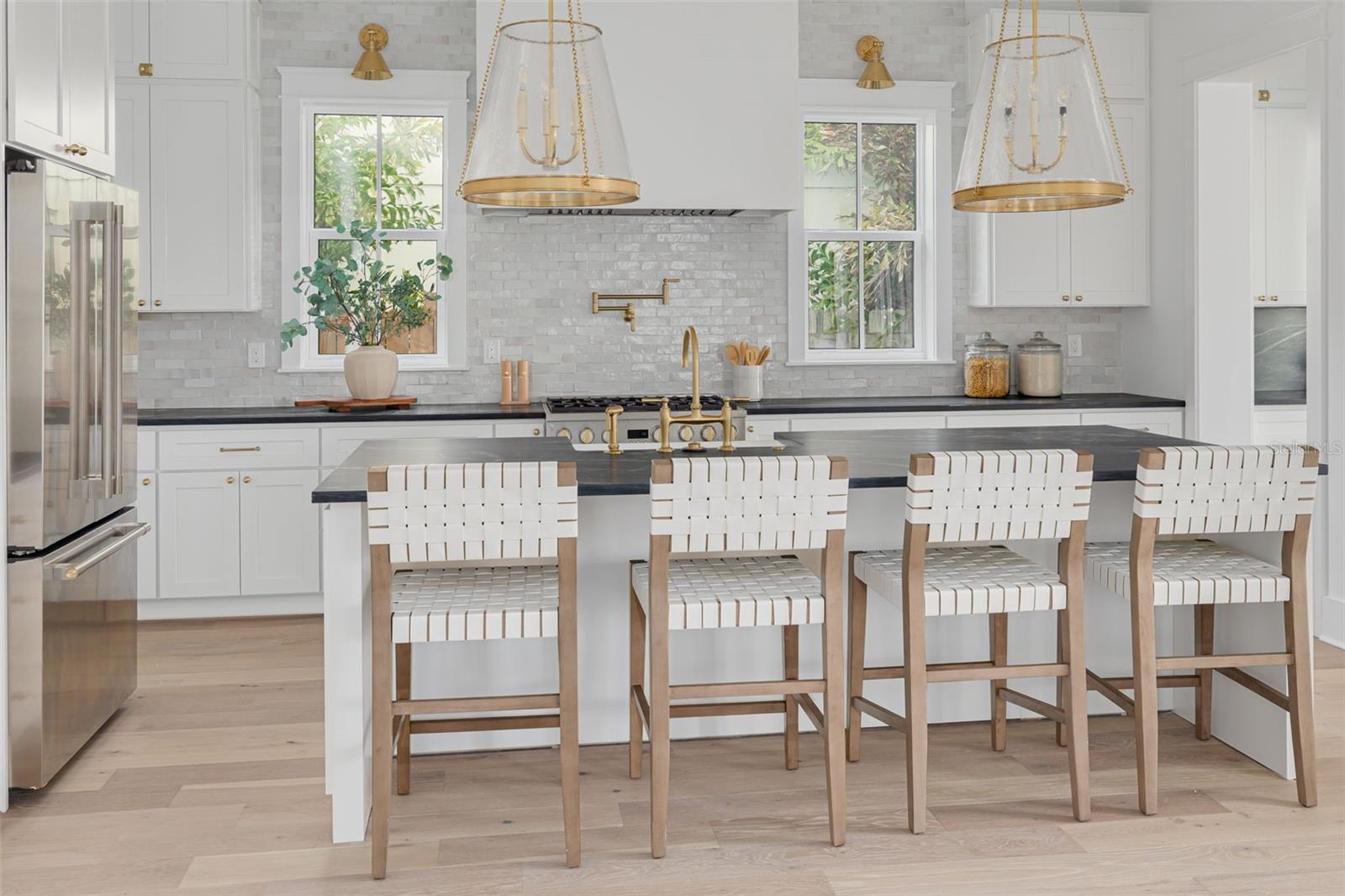 Step into refined living in this MOVE-IN READY Canopy Builders home--crafted with exceptional detail by St. Petersburg's most trusted name in luxury construction. Nestled on a quiet street in the Five Points neighborhood and located in a NON FLOOD ZONE, this Langford Franklin model offers 5 bedrooms plus a loft, 3 bathrooms, and a detached two-car garage, with 2,990 square feet of beautifully designed living space. A brick paver walkway and Canopy's signature gas lantern set the tone for timeless curb appeal. Inside, the flexible floor plan adapts to your lifestyle. The study and guest bedroom near the foyer can serve as a private office, guest suite, or hobby room. A full bath is conveniently located nearby, featuring premium fixtures, a wall-mounted faucet, and an elegant vanity that blends style with function. At the heart of the home, the open-concept great room flows seamlessly into the gourmet kitchen. The kitchen showcases shaker-style maple cabinetry with soft-close drawers, 42" upper cabinets stacked to the ceiling, a large island with Marine Black Soapstone countertop, a convenient pot filler, and a premium Monogram appliance package. A walk-in pantry provides abundant storage for everyday essentials, while the mudroom with built-ins keeps everything organized and offers direct access to the backyard. Upstairs, the multipurpose loft provides endless possibilities, from an entertainment lounge to a playroom or additional living space. The spacious laundry room offers a sink, storage, and workspace. The expansive primary suite serves as a private retreat, dual vanities with wall-mounted faucets, a soaking tub, walk-in shower, and a private water closet. Every detail has been thoughtfully planned, from the pre-designed finish package and Hardie Board plank siding to impact-resistant windows, a tankless gas water heater, engineered hardwood flooring throughout, and dual digital thermostats for independent climate control. Luxury touches include 10' ceilings on the main level, 9' ceilings upstairs, and 8' interior doors. Outside, the backyard offers the perfect canvas for your dream oasis--whether that's a sparkling pool, outdoor kitchen, or a serene garden retreat - you have the space to make it your very own! Ideally located just minutes from Downtown St. Petersburg, Vinoy Park, award-winning Gulf beaches, and a short 20-minute drive to Tampa, this home offers the perfect blend of style, comfort, and convenience.